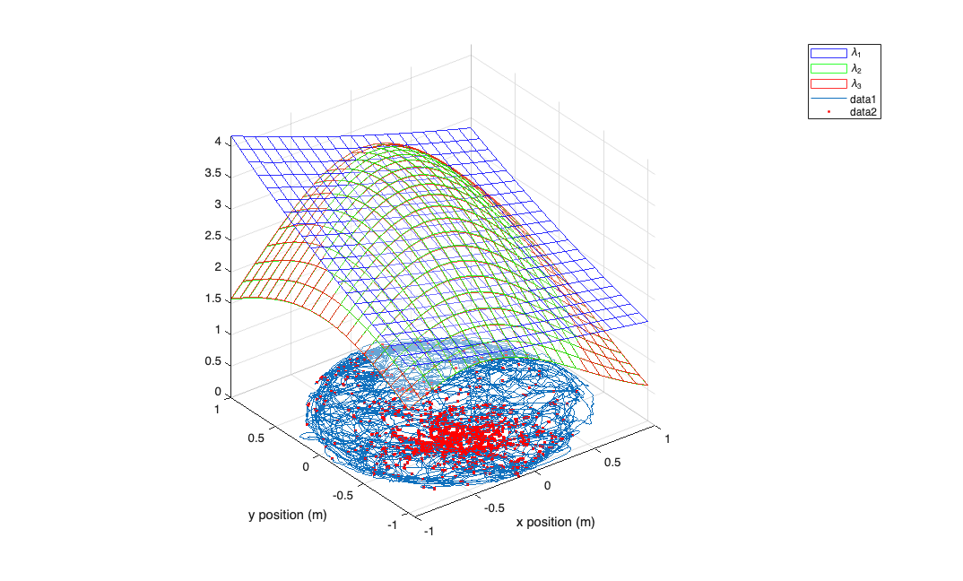 figure; [x_new,y_new]=meshgrid(-1:.1:1); %define new x and y y_new = flipud(y_new); x_new = fliplr(x_new); %For each covariate new to place the new data in a cell array newData{1} =ones(size(x_new)); newData{2} =x_new; newData{3} =y_new; newData{4} =x_new.^2; newData{5} =y_new.^2; newData{6} =x_new.*y_new; color = Analysis.colors; % Evaluate our fits using the new parameters for i=1:fitResults.numResults lambda = fitResults.evalLambda(i,newData); h_mesh = mesh(x_new,y_new,lambda,'AlphaData',0); get(h_mesh,'AlphaData'); set(h_mesh,'FaceAlpha',0.2,'EdgeAlpha',0.8,'EdgeColor',color{i}); %figure; hold on; end legend(fitResults.lambda.dataLabels); plot(position.getSubSignal('x').dataToMatrix,position.getSubSignal('y').dataToMatrix,... values_at_spiketimes(:,1),values_at_spiketimes(:,2),'r.'); axis tight square; xlabel('x position (m)'); ylabel('y position (m)');