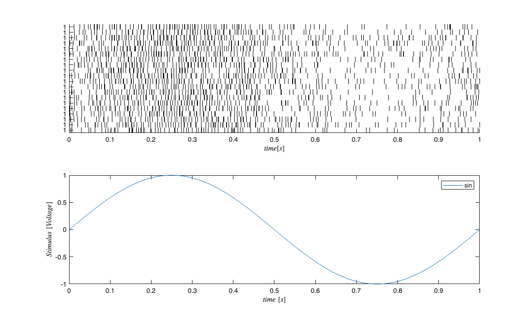 close all; % clear all; delta = 0.001; Tmax = 1; time = 0:delta:Tmax; f=1; b1=1;b0=-2; stimData = b1*sin(2*pi*f*time); e = zeros(length(time),1); %No Ensemble input mu = b0; %baseline firing rate Ts=delta; histCoeffs= [-2 -2 -4]; windowTimes=[0 .001 0.002 0.003]; histObj = History(windowTimes); filts = histObj.toFilter(Ts); %Convert to transfer function matrix H=histCoeffs*filts; %scale each window transfer function by its coefficient S=tf([1],1,Ts,'Variable','z^-1'); %Feed the stimulus in directly E=tf([0],1,Ts,'Variable','z^-1'); %No ensemble effect stim=Covariate(time',stimData,'Stimulus','time','s','Voltage',{'sin'}); ens =Covariate(time',e,'Ensemble','time','s','Spikes',{'n1'}); numRealizations = 20; %Number of sample paths to generate sC=CIF.simulateCIF(mu,H,S,E,stim,ens,numRealizations); figure; subplot(2,1,1); sC.plot; subplot(2,1,2); stim.plot; for i=1:numRealizations % Construct a CIF object for each realization based on our encoding % results above %correct CIF w/ History lambdaCIF{i} = CIF([mu b1],{'1','x'},{'x'},'binomial',histCoeffs,histObj); %CIF ignoring the history effect lambdaCIFNoHist{i} = CIF([mu b1],{'1','x'},{'x'},'binomial'); end sC.resample(1/delta); dN=sC.dataToMatrix; % Make noise according to the dynamic range of the stimulus Q=2*std(stim.data(2:end)-stim.data(1:end-1)); Px0=.1; A=1; % Decode with the correct and incorrect CIFs [x_p, W_p, x_u, W_u] = DecodingAlgorithms.PPDecodeFilter(A, Q, Px0, dN',lambdaCIF,delta); [x_pNoHist, W_pNoHist, x_uNoHist, W_uNoHist] = DecodingAlgorithms.PPDecodeFilter(A, Q, Px0, dN',lambdaCIFNoHist,delta); % Compare the results figure; subplot(2,1,1); zVal=3; ciLower = min(x_u(1:end)-zVal*squeeze(W_u(1:end))',x_u(1:end)+zVal*squeeze(W_u(1:end))'); ciUpper = max(x_u(1:end)-zVal*squeeze(W_u(1:end))',x_u(1:end)+zVal*squeeze(W_u(1:end))'); hEst=plot(time,x_u(1:end),'b',time,ciLower,'g',time,ciUpper,'r'); hold on; hold all; hStim=stim.plot([],{{' ''k'',''Linewidth'',2'}}); legend off; legend([hEst(1) hEst(2) hEst(3) hStim],'x_{k|k}(t)',strcat('x_{k|k}(t)-',num2str(zVal),'\sigma_{k|k}'),... strcat('x_{k|k}(t)+',num2str(zVal),'\sigma_{k|k}'),'x_{k|k}(t)','x(t)'); title(['Decoded Stimulus +/- 99% confidence intervals using ' num2str(numRealizations) ' cells']); subplot(2,1,2); zVal=3; ciLower = min(x_uNoHist(1:end)-zVal*squeeze(W_uNoHist(1:end))',x_uNoHist(1:end)+zVal*squeeze(W_uNoHist(1:end))'); ciUpper = max(x_uNoHist(1:end)-zVal*squeeze(W_uNoHist(1:end))',x_uNoHist(1:end)+zVal*squeeze(W_uNoHist(1:end))'); hEst=plot(time,x_uNoHist(1:end),'b',time,ciLower,'g',time,ciUpper,'r'); hold on; hold all; hStim=stim.plot([],{{' ''k'',''Linewidth'',2'}}); legend off; legend([hEst(1) hEst(2) hEst(3) hStim],'x_{k|k}(t)',strcat('x_{k|k}(t)-',num2str(zVal),'\sigma_{k|k}'),... strcat('x_{k|k}(t)+',num2str(zVal),'\sigma_{k|k}'),'x_{k|k}(t)','x(t)'); title(['Decoded Stimulus No Hist +/- 99% confidence intervals using ' num2str(numRealizations) ' cells']);