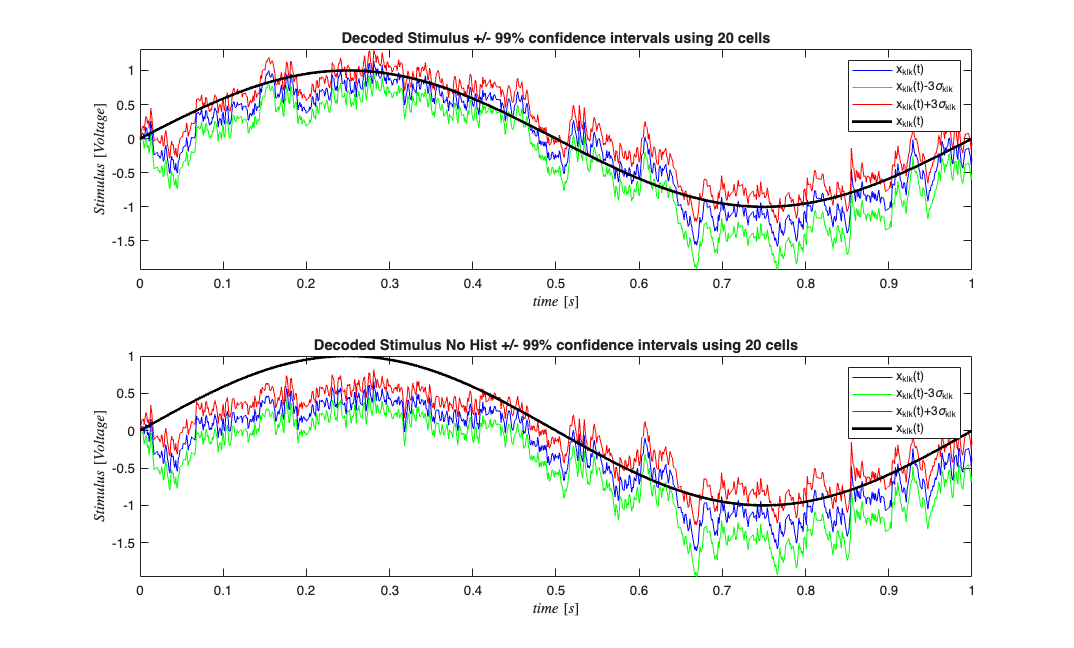 We see that inclusion of history effect improves (as expected) the decoding of the stimulus based on the point process observations