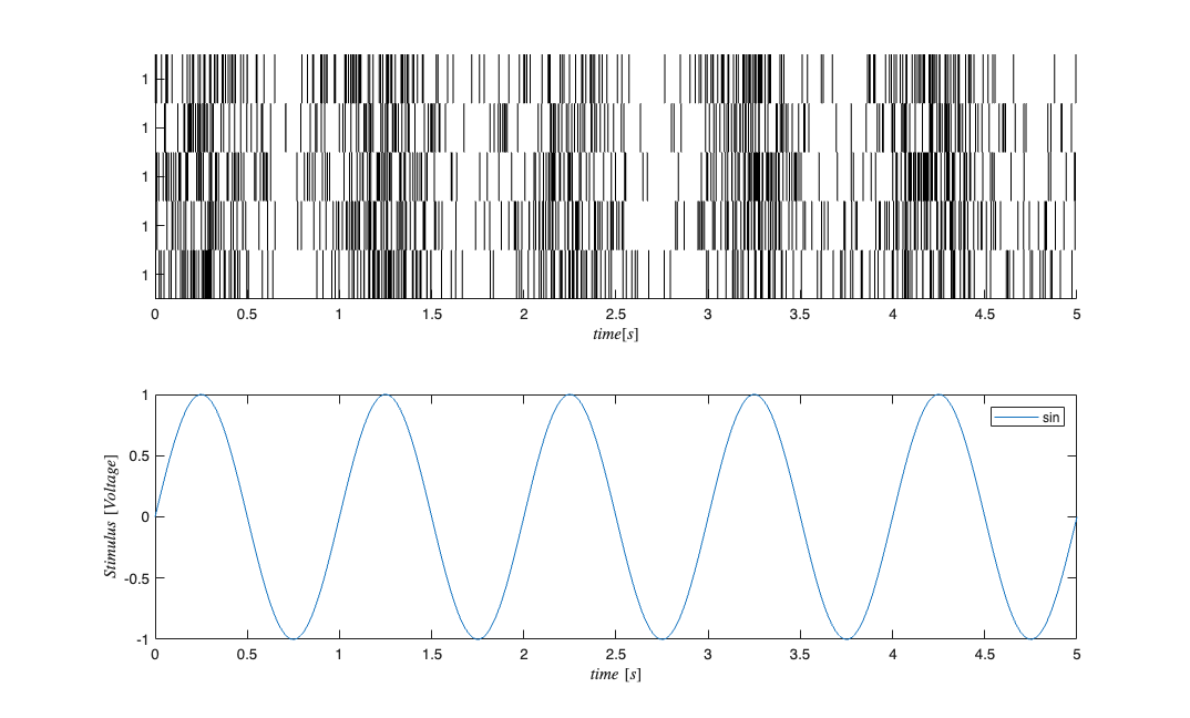 f=1; %Stimulus frequency u = sin(2*pi*f*t)'; %Make this neuron modulated by a sine wave e = zeros(length(t),1); %No Ensemble input stim=Covariate(t',u,'Stimulus','time','s','Voltage',{'sin'}); ens =Covariate(t',e,'Ensemble','time','s','Spikes',{'n1'}); numRealizations = 5; %Number of sample paths to generate fitType = 'binomial'; sC=CIF.simulateCIF(mu,H,S,E,stim,ens,numRealizations,fitType); figure; subplot(2,1,1); sC.plot; v=axis; axis([0 tMax/10 v(3) v(4)]); subplot(2,1,2); stim.plot; v=axis; axis([0 tMax/10 v(3) v(4)]);