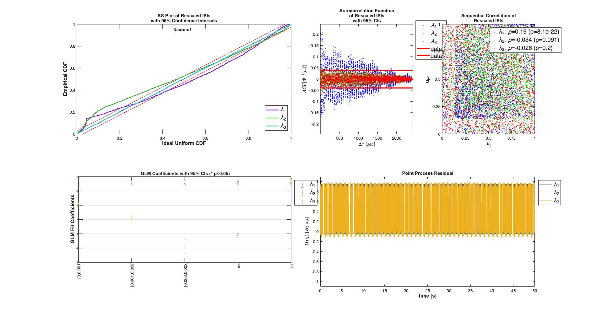 In this demo, we show how sample-paths of a point process (PP) can be generated from specification of its conditional intensity function (CIF). We then use the generated PP data to validate the outputs of the Neural Spike Analysis Toolbox.