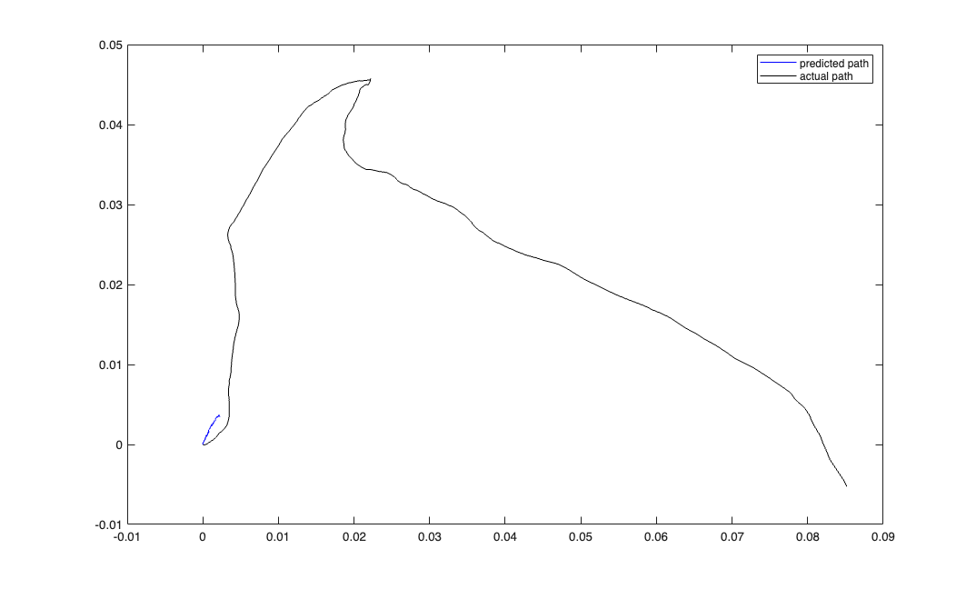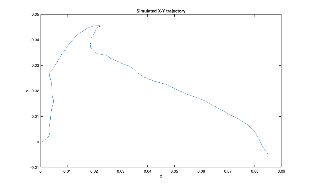 delta = 0.001; Tmax = 1; time = 0:delta:Tmax; px = zeros(1,length(time)); py = zeros(1,length(time)); Q=.01; r = Q.*randn(2,length(time)); vx = cumsum(r(1,:))'; vy = cumsum(r(2,:))'; velSig = SignalObj(time, [vx, vy],'vel'); posSig = velSig.integral; posData = posSig.data; px = posData(:,1); py = posData(:,2); % N=100; A=1; B=ones(1,N)./N; % px = filtfilt(B,A,px); % py = filtfilt(B,A,py); figure; plot(px,py); title('Simulated X-Y trajectory'); xlabel('x'); ylabel('y');