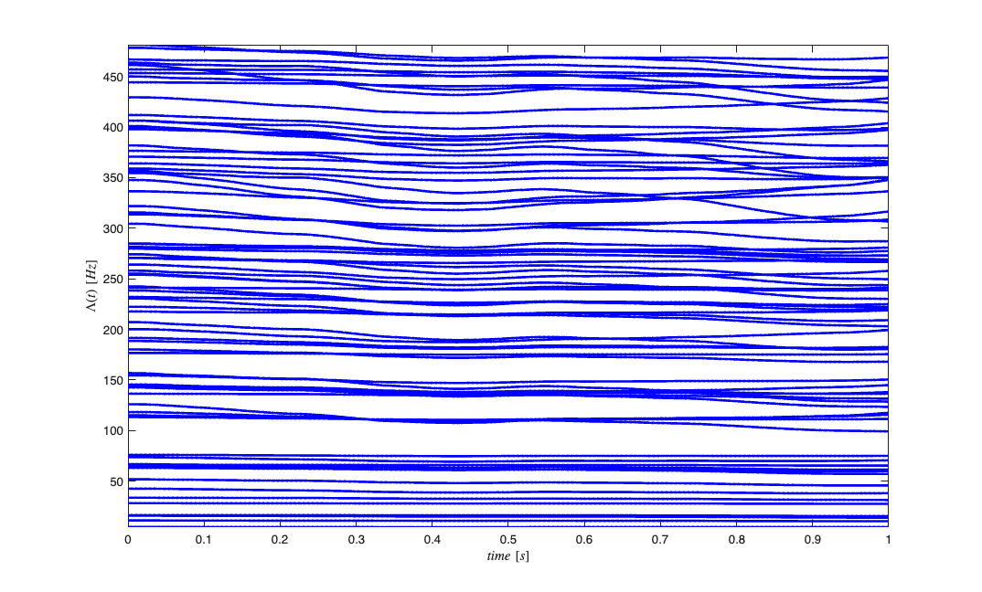 clear lambdaCIF lambda tempSpikeColl n spikeColl numRealizations=80; coeffs = -abs(1*randn(numRealizations,5)); coeffs = [-2*abs(randn(numRealizations,1)) coeffs]; dataMat = [ones(length(time),1) px py px.^2 py.^2 px.*py]; for i=1:numRealizations tempData = exp(dataMat*coeffs(i,:)'); lambdaData = tempData./(1+tempData); lambda{i}=Covariate(time,lambdaData./delta, '\Lambda(t)','time','s','Hz',{strcat('\lambda_{',num2str(i),'}')},{{' ''b'', ''LineWidth'' ,2'}}); tempSpikeColl{i} = CIF.simulateCIFByThinningFromLambda(lambda{i},1); n{i} = tempSpikeColl{i}.getNST(1); n{i}.setName(num2str(i)); try lambdaCIF{i} = CIF(coeffs(i,:),{'1','x','y','x^2','y^2','x*y'},{'x','y'},'binomial'); catch ME_sym if(i==1) warning('StimulusDecode2D:SymbolicCIFFallback', ... ['CIF symbolic setup failed (' ME_sym.identifier '). Decoder will use linear fallback.']); end lambdaCIF{i} = []; end end % View the different neuron conditional intensity functions figure; for i=1:length(lambda) lambda{i}.plot; end legend off; % Visualize Simulated Receptive Fields clear placeField; [X,Y]=meshgrid(-2:.1:2,-2:.1:2); figure; for i=1:numRealizations tempData = coeffs(i,1) + coeffs(i,2)*X + coeffs(i,3)*Y +coeffs(i,4)*X.^2 + coeffs(i,5)*Y.^2 + coeffs(i,6).*X.*Y; placeField{i} = exp(tempData)./(1+exp(tempData))./delta; %rate based on logistic link function end fact=factor(numRealizations); for i=1:numRealizations if(length(fact)==1) subplot(1,numRealizations,i); elseif(length(fact)==2) subplot(fact(1),fact(2),i); elseif(length(fact)==3) subplot(fact(1)*fact(2),fact(3),i); end pcolor(X,Y,placeField{i}), shading interp axis square; set(gca,'xtick',[],'ytick',[]); end