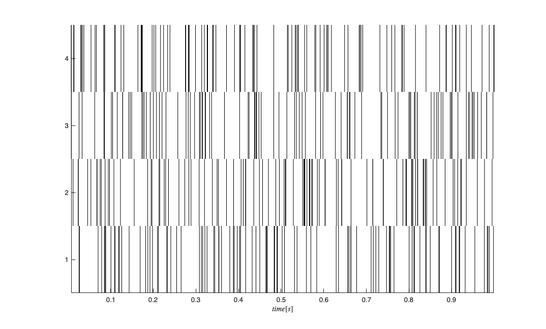clear nst; for i=1:4 spikeTimes = sort(rand(1,100))*lengthTrial; nst{i}=nspikeTrain(spikeTimes,'',.001); end spikeColl=nstColl(nst); %create a nstColl figure; spikeColl.plot;