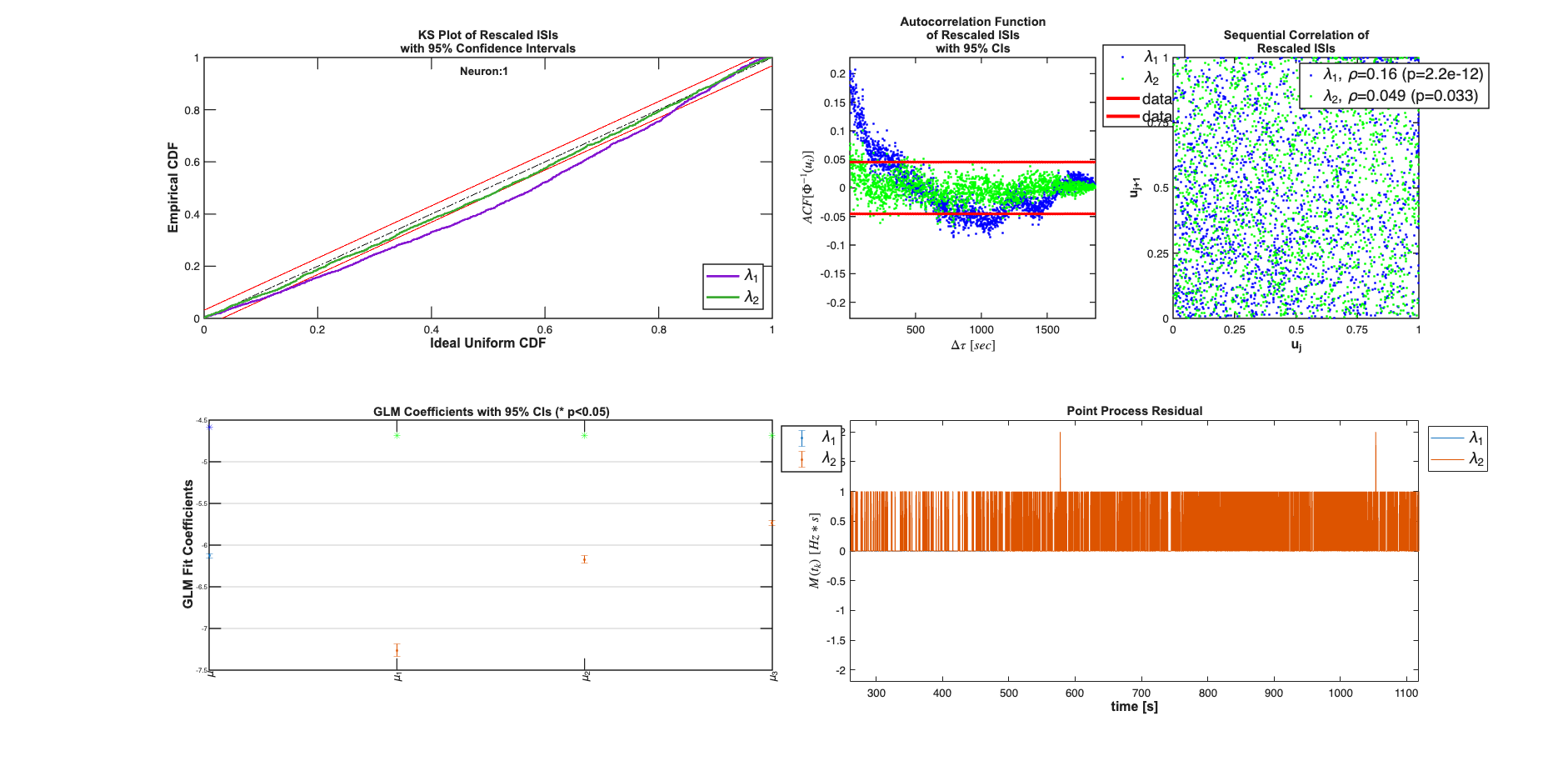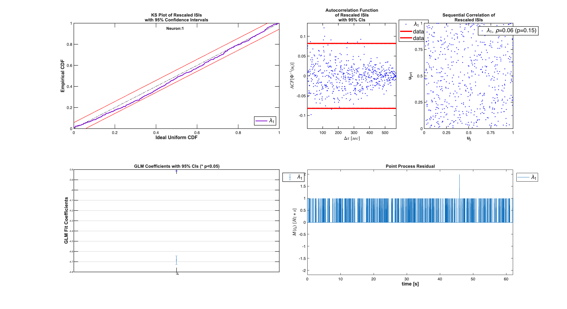 close all; [~,mEPSCDir] = getPaperDataDirs(); epsc2 = importdata(fullfile(mEPSCDir,'epsc2.txt')); sampleRate = 1000; spikeTimes = epsc2.data(:,2)*1/sampleRate; %in seconds nst = nspikeTrain(spikeTimes); time = 0:(1/sampleRate):nst.maxTime; % Define Covariates for the analysis baseline = Covariate(time,ones(length(time),1),'Baseline','time','s','',{'\mu'}); covarColl = CovColl({baseline}); % Create the trial structure spikeColl = nstColl(nst); trial = Trial(spikeColl,covarColl); % Define how we want to analyze the data clear tc tcc; tc{1} = TrialConfig({{'Baseline','\mu'}},sampleRate,[]); tc{1}.setName('Constant Baseline'); tcc = ConfigColl(tc); % Perform Analysis (Commented to since data already saved) results =Analysis.RunAnalysisForAllNeurons(trial,tcc,0); results.plotResults;