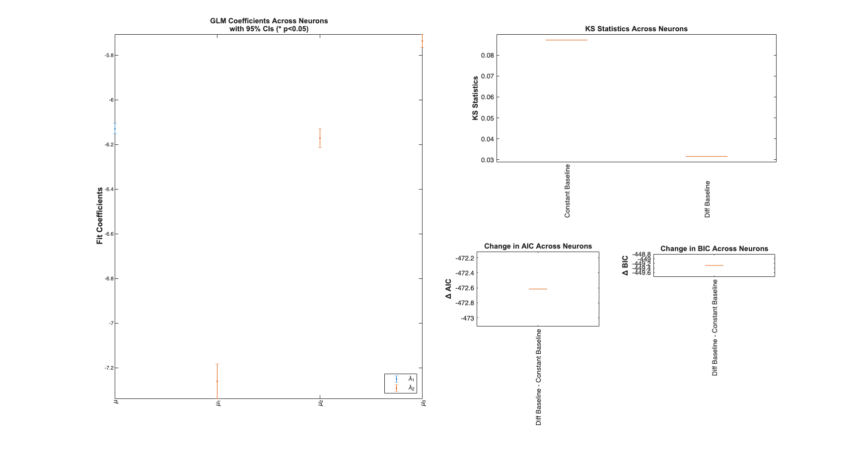 We see that the piece-wise constant rate model (with and without history, outperform the constant baseline model in terms of AIC, BIC, and KS-statistic. While addition of the history effect yields a model that falls within the 95% confidence interval of the KS plot, it results in increases of the AIC and BIC because of the increased number of parameters.