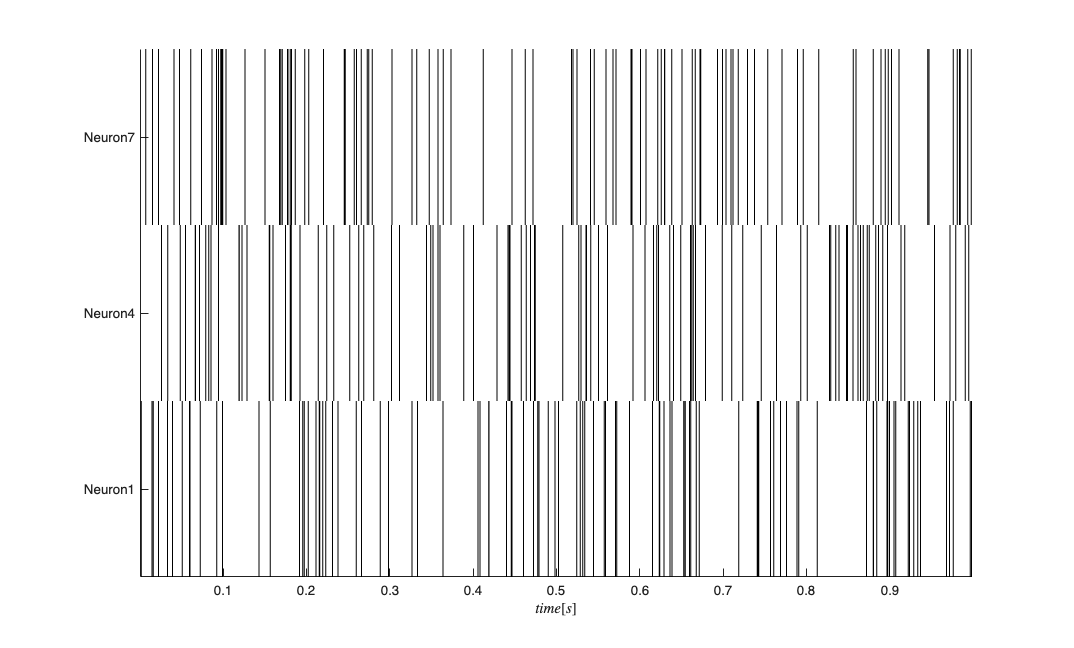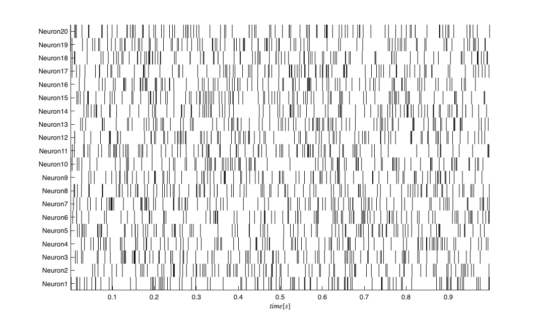 close all; clear all; for i=1:20 spikeTimes = sort(rand(1,100))*1; nst{i}=nspikeTrain(spikeTimes,'',.1); nst{i}.setName(strcat('Neuron',num2str(i))); end spikeColl=nstColl(nst);