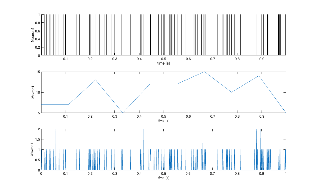 figure; n1=spikeColl.getNST(1); %get the first nspikeTrain in the collection subplot(3,1,1); n1.plot; subplot(3,1,2); n1.getSigRep.plot; %plot current sigRep % get a SignalObj representation 1ms bins from 0 to 10 sec s1=n1.getSigRep(.001,0,1); subplot(3,1,3); s1.plot;